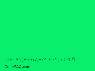 CIELab 83.67,-74.975,50.42 Color is a normal green color and the nearest color is Spring Green #00ff7f. Hex code #08f06b and RGB value is rgb(8,240,107). In RGB color space, this color is composed of 3% red, 94% green, 42% blue, In CMYK color space, this color is composed of 97% cyan, 0% magenta, 55% yellow , 6% black , In HSL color space, this color has a hue angle of 146° , 94% saturation and 49% lightness.