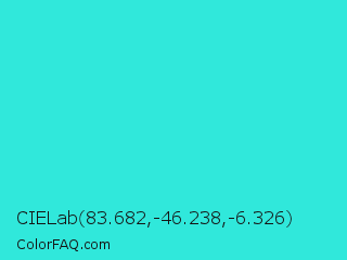 CIELab 83.682,-46.238,-6.326 Color is a normal cyan color and the nearest color is Turquoise #40e0d0. Hex code #30e8db and RGB value is rgb(48,232,219). In RGB color space, this color is composed of 19% red, 91% green, 86% blue, In CMYK color space, this color is composed of 79% cyan, 0% magenta, 6% yellow , 9% black , In HSL color space, this color has a hue angle of 176° , 80% saturation and 55% lightness.