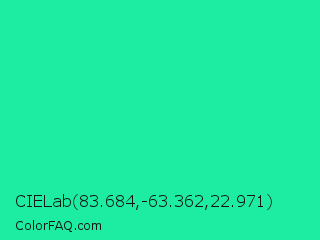 CIELab 83.684,-63.362,22.971 Color is a normal green color and the nearest color is Medium Spring Green #00fa9a. Hex code #1ceda3 and RGB value is rgb(28,237,163). In RGB color space, this color is composed of 11% red, 93% green, 64% blue, In CMYK color space, this color is composed of 88% cyan, 0% magenta, 31% yellow , 7% black , In HSL color space, this color has a hue angle of 159° , 85% saturation and 52% lightness.