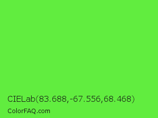 CIELab 83.688,-67.556,68.468 Color is a normal green color and the nearest color is Screamin Green #66ff66. Hex code #61ed3f and RGB value is rgb(97,237,63). In RGB color space, this color is composed of 38% red, 93% green, 25% blue, In CMYK color space, this color is composed of 59% cyan, 0% magenta, 73% yellow , 7% black , In HSL color space, this color has a hue angle of 108° , 83% saturation and 59% lightness.