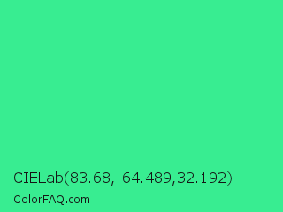 CIELab 83.68,-64.489,32.192 Color is a normal green color and the nearest color is Eucalyptus #44d7a8. Hex code #38ed91 and RGB value is rgb(56,237,145). In RGB color space, this color is composed of 22% red, 93% green, 57% blue, In CMYK color space, this color is composed of 76% cyan, 0% magenta, 39% yellow , 7% black , In HSL color space, this color has a hue angle of 150° , 83% saturation and 57% lightness.