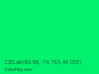 CIELab 83.68,-74.763,49.055 Color is a normal green color and the nearest color is Spring Green #00ff7f. Hex code #01f06e and RGB value is rgb(1,240,110). In RGB color space, this color is composed of 0% red, 94% green, 43% blue, In CMYK color space, this color is composed of 100% cyan, 0% magenta, 54% yellow , 6% black , In HSL color space, this color has a hue angle of 147° , 99% saturation and 47% lightness.