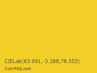 CIELab 83.691,-3.288,78.553 Color is a normal yellow color and the nearest color is Golden Dream #f0d52d. Hex code #f1cf27 and RGB value is rgb(241,207,39). In RGB color space, this color is composed of 95% red, 81% green, 15% blue, In CMYK color space, this color is composed of 0% cyan, 14% magenta, 84% yellow , 5% black , In HSL color space, this color has a hue angle of 50° , 88% saturation and 55% lightness.