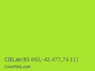 CIELab 83.692,-42.477,74.11 Color is a normal green color and the nearest color is Green Lizard #a7f432. Hex code #a8e330 and RGB value is rgb(168,227,48). In RGB color space, this color is composed of 66% red, 89% green, 19% blue, In CMYK color space, this color is composed of 26% cyan, 0% magenta, 79% yellow , 11% black , In HSL color space, this color has a hue angle of 80° , 76% saturation and 54% lightness.