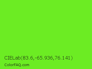 CIELab 83.6,-65.936,76.141 Color is a normal green color and the nearest color is Spring Frost #87ff2a. Hex code #6cec23 and RGB value is rgb(108,236,35). In RGB color space, this color is composed of 42% red, 93% green, 14% blue, In CMYK color space, this color is composed of 54% cyan, 0% magenta, 85% yellow , 7% black , In HSL color space, this color has a hue angle of 98° , 84% saturation and 53% lightness.