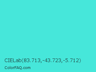 CIELab 83.713,-43.723,-5.712 Color is a normal cyan color and the nearest color is Turquoise #40e0d0. Hex code #46e7da and RGB value is rgb(70,231,218). In RGB color space, this color is composed of 27% red, 91% green, 85% blue, In CMYK color space, this color is composed of 70% cyan, 0% magenta, 6% yellow , 9% black , In HSL color space, this color has a hue angle of 175° , 77% saturation and 59% lightness.