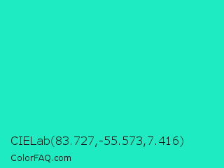 CIELab 83.727,-55.573,7.416 Color is a normal cyan color and the nearest color is Turquoise PWG #30d5c8. Hex code #1eebc1 and RGB value is rgb(30,235,193). In RGB color space, this color is composed of 12% red, 92% green, 76% blue, In CMYK color space, this color is composed of 87% cyan, 0% magenta, 18% yellow , 8% black , In HSL color space, this color has a hue angle of 168° , 84% saturation and 52% lightness.