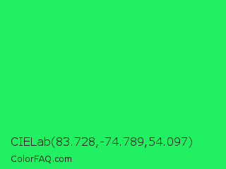 CIELab 83.728,-74.789,54.097 Color is a normal green color and the nearest color is Malachite #0bda51. Hex code #21f063 and RGB value is rgb(33,240,99). In RGB color space, this color is composed of 13% red, 94% green, 39% blue, In CMYK color space, this color is composed of 86% cyan, 0% magenta, 59% yellow , 6% black , In HSL color space, this color has a hue angle of 139° , 87% saturation and 54% lightness.