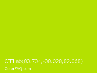 CIELab 83.734,-38.028,82.068 Color is a normal lime color and the nearest color is Fuego #bede0d. Hex code #b4e101 and RGB value is rgb(180,225,1). In RGB color space, this color is composed of 71% red, 88% green, 0% blue, In CMYK color space, this color is composed of 20% cyan, 0% magenta, 100% yellow , 12% black , In HSL color space, this color has a hue angle of 72° , 99% saturation and 44% lightness.