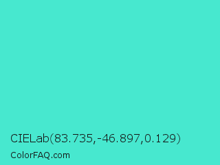 CIELab 83.735,-46.897,0.129 Color is a normal cyan color and the nearest color is Turquoise #40e0d0. Hex code #47e8cf and RGB value is rgb(71,232,207). In RGB color space, this color is composed of 28% red, 91% green, 81% blue, In CMYK color space, this color is composed of 69% cyan, 0% magenta, 11% yellow , 9% black , In HSL color space, this color has a hue angle of 171° , 78% saturation and 59% lightness.