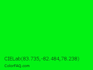 CIELab 83.735,-82.484,78.238 Color is a normal green color and the nearest color is Green #00ff00. Hex code #01f213 and RGB value is rgb(1,242,19). In RGB color space, this color is composed of 0% red, 95% green, 7% blue, In CMYK color space, this color is composed of 100% cyan, 0% magenta, 92% yellow , 5% black , In HSL color space, this color has a hue angle of 124° , 99% saturation and 48% lightness.