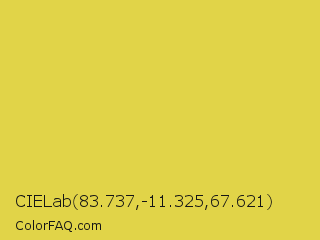 CIELab 83.737,-11.325,67.621 Color is a normal yellow color and the nearest color is Wattle #dcd747. Hex code #e1d448 and RGB value is rgb(225,212,72). In RGB color space, this color is composed of 88% red, 83% green, 28% blue, In CMYK color space, this color is composed of 0% cyan, 6% magenta, 68% yellow , 12% black , In HSL color space, this color has a hue angle of 55° , 72% saturation and 58% lightness.