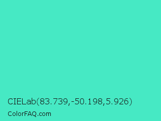 CIELab 83.739,-50.198,5.926 Color is a normal cyan color and the nearest color is Turquoise #40e0d0. Hex code #46e9c4 and RGB value is rgb(70,233,196). In RGB color space, this color is composed of 27% red, 91% green, 77% blue, In CMYK color space, this color is composed of 70% cyan, 0% magenta, 16% yellow , 9% black , In HSL color space, this color has a hue angle of 166° , 79% saturation and 59% lightness.