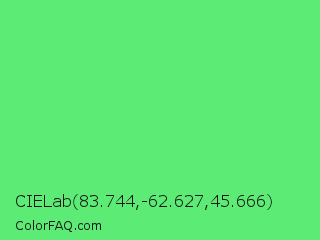 CIELab 83.744,-62.627,45.666 Color is a light green color and the nearest color is Very Light Malachite Green #64e986. Hex code #5cec76 and RGB value is rgb(92,236,118). In RGB color space, this color is composed of 36% red, 93% green, 46% blue, In CMYK color space, this color is composed of 61% cyan, 0% magenta, 50% yellow , 7% black , In HSL color space, this color has a hue angle of 131° , 79% saturation and 64% lightness.