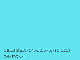 CIELab 83.754,-32.675,-15.626 Color is a light cyan color and the nearest color is Turquoise Blue #6cdae7. Hex code #61e3ed and RGB value is rgb(97,227,237). In RGB color space, this color is composed of 38% red, 89% green, 93% blue, In CMYK color space, this color is composed of 59% cyan, 4% magenta, 0% yellow , 7% black , In HSL color space, this color has a hue angle of 184° , 80% saturation and 65% lightness.