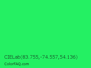 CIELab 83.755,-74.557,54.136 Color is a normal green color and the nearest color is Malachite #0bda51. Hex code #24f063 and RGB value is rgb(36,240,99). In RGB color space, this color is composed of 14% red, 94% green, 39% blue, In CMYK color space, this color is composed of 85% cyan, 0% magenta, 59% yellow , 6% black , In HSL color space, this color has a hue angle of 139° , 87% saturation and 54% lightness.