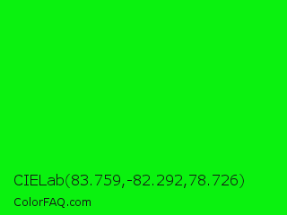 CIELab 83.759,-82.292,78.726 Color is a normal green color and the nearest color is Green #00ff00. Hex code #0af20f and RGB value is rgb(10,242,15). In RGB color space, this color is composed of 4% red, 95% green, 6% blue, In CMYK color space, this color is composed of 96% cyan, 0% magenta, 94% yellow , 5% black , In HSL color space, this color has a hue angle of 121° , 92% saturation and 49% lightness.