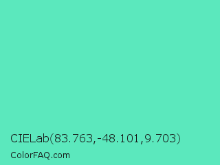 CIELab 83.763,-48.101,9.703 Color is a light green color and the nearest color is Medium Aquamarine #66ddaa. Hex code #5be8bd and RGB value is rgb(91,232,189). In RGB color space, this color is composed of 36% red, 91% green, 74% blue, In CMYK color space, this color is composed of 61% cyan, 0% magenta, 19% yellow , 9% black , In HSL color space, this color has a hue angle of 162° , 75% saturation and 63% lightness.