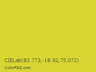 CIELab 83.773,-18.92,75.072 Color is a normal yellow color and the nearest color is Pear #d1e231. Hex code #d6d831 and RGB value is rgb(214,216,49). In RGB color space, this color is composed of 84% red, 85% green, 19% blue, In CMYK color space, this color is composed of 1% cyan, 0% magenta, 77% yellow , 15% black , In HSL color space, this color has a hue angle of 61° , 68% saturation and 52% lightness.