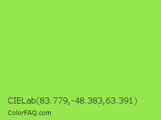 CIELab 83.779,-48.383,63.391 Color is a light green color and the nearest color is Kiwi #8ee53f. Hex code #96e64f and RGB value is rgb(150,230,79). In RGB color space, this color is composed of 59% red, 90% green, 31% blue, In CMYK color space, this color is composed of 35% cyan, 0% magenta, 66% yellow , 10% black , In HSL color space, this color has a hue angle of 92° , 75% saturation and 61% lightness.