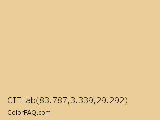 CIELab 83.787,3.339,29.292 Color is a light orange color and the nearest color is Manhattan #f5c999. Hex code #ebcd9a and RGB value is rgb(235,205,154). In RGB color space, this color is composed of 92% red, 80% green, 60% blue, In CMYK color space, this color is composed of 0% cyan, 13% magenta, 34% yellow , 8% black , In HSL color space, this color has a hue angle of 38° , 67% saturation and 76% lightness.