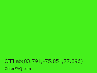 CIELab 83.791,-75.851,77.396 Color is a normal green color and the nearest color is Neon Green #39ff14. Hex code #45f01b and RGB value is rgb(69,240,27). In RGB color space, this color is composed of 27% red, 94% green, 11% blue, In CMYK color space, this color is composed of 71% cyan, 0% magenta, 89% yellow , 6% black , In HSL color space, this color has a hue angle of 108° , 88% saturation and 52% lightness.