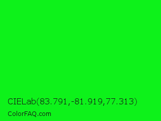 CIELab 83.791,-81.919,77.313 Color is a normal green color and the nearest color is Green #00ff00. Hex code #0df21a and RGB value is rgb(13,242,26). In RGB color space, this color is composed of 5% red, 95% green, 10% blue, In CMYK color space, this color is composed of 95% cyan, 0% magenta, 89% yellow , 5% black , In HSL color space, this color has a hue angle of 123° , 90% saturation and 50% lightness.