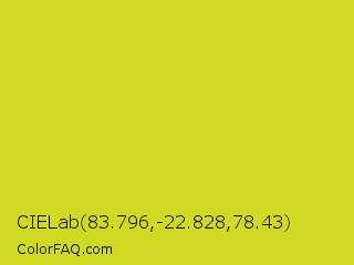 CIELab 83.796,-22.828,78.43 Color is a normal yellow color and the nearest color is Pear #d1e231. Hex code #d0da23 and RGB value is rgb(208,218,35). In RGB color space, this color is composed of 82% red, 85% green, 14% blue, In CMYK color space, this color is composed of 5% cyan, 0% magenta, 84% yellow , 15% black , In HSL color space, this color has a hue angle of 63° , 72% saturation and 50% lightness.