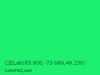 CIELab 83.806,-73.689,49.236 Color is a normal green color and the nearest color is Spring Green #00ff7f. Hex code #1cf06e and RGB value is rgb(28,240,110). In RGB color space, this color is composed of 11% red, 94% green, 43% blue, In CMYK color space, this color is composed of 88% cyan, 0% magenta, 54% yellow , 6% black , In HSL color space, this color has a hue angle of 143° , 88% saturation and 53% lightness.