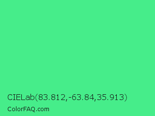 CIELab 83.812,-63.84,35.913 Color is a normal green color and the nearest color is Very Light Malachite Green #64e986. Hex code #46ed8a and RGB value is rgb(70,237,138). In RGB color space, this color is composed of 27% red, 93% green, 54% blue, In CMYK color space, this color is composed of 70% cyan, 0% magenta, 42% yellow , 7% black , In HSL color space, this color has a hue angle of 144° , 82% saturation and 60% lightness.