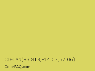 CIELab 83.813,-14.03,57.06 Color is a light yellow color and the nearest color is Booger Buster #dde26a. Hex code #d9d661 and RGB value is rgb(217,214,97). In RGB color space, this color is composed of 85% red, 84% green, 38% blue, In CMYK color space, this color is composed of 0% cyan, 1% magenta, 55% yellow , 15% black , In HSL color space, this color has a hue angle of 59° , 61% saturation and 62% lightness.