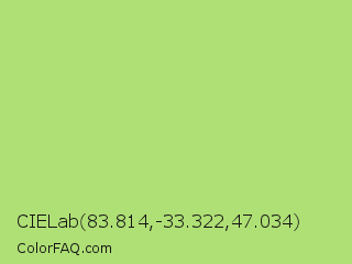 CIELab 83.814,-33.322,47.034 Color is a light green color and the nearest color is Yellow Green #c5e17a. Hex code #afe075 and RGB value is rgb(175,224,117). In RGB color space, this color is composed of 69% red, 88% green, 46% blue, In CMYK color space, this color is composed of 22% cyan, 0% magenta, 48% yellow , 12% black , In HSL color space, this color has a hue angle of 87° , 63% saturation and 67% lightness.