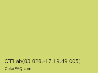 CIELab 83.828,-17.19,49.005 Color is a light yellow color and the nearest color is Yellow Green #c5e17a. Hex code #d0d872 and RGB value is rgb(208,216,114). In RGB color space, this color is composed of 82% red, 85% green, 45% blue, In CMYK color space, this color is composed of 4% cyan, 0% magenta, 47% yellow , 15% black , In HSL color space, this color has a hue angle of 65° , 57% saturation and 65% lightness.