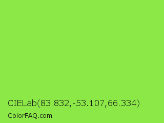 CIELab 83.832,-53.107,66.334 Color is a normal green color and the nearest color is Kiwi #8ee53f. Hex code #8ce847 and RGB value is rgb(140,232,71). In RGB color space, this color is composed of 55% red, 91% green, 28% blue, In CMYK color space, this color is composed of 40% cyan, 0% magenta, 69% yellow , 9% black , In HSL color space, this color has a hue angle of 94° , 78% saturation and 59% lightness.