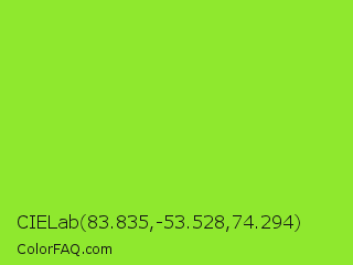 CIELab 83.835,-53.528,74.294 Color is a normal green color and the nearest color is Kiwi #8ee53f. Hex code #8fe82e and RGB value is rgb(143,232,46). In RGB color space, this color is composed of 56% red, 91% green, 18% blue, In CMYK color space, this color is composed of 38% cyan, 0% magenta, 80% yellow , 9% black , In HSL color space, this color has a hue angle of 89° , 80% saturation and 55% lightness.