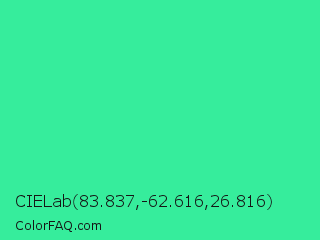 CIELab 83.837,-62.616,26.816 Color is a normal green color and the nearest color is Eucalyptus #44d7a8. Hex code #36ed9c and RGB value is rgb(54,237,156). In RGB color space, this color is composed of 21% red, 93% green, 61% blue, In CMYK color space, this color is composed of 77% cyan, 0% magenta, 34% yellow , 7% black , In HSL color space, this color has a hue angle of 153° , 84% saturation and 57% lightness.