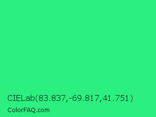 CIELab 83.837,-69.817,41.751 Color is a normal green color and the nearest color is UFO Green #3cd070. Hex code #2bef7e and RGB value is rgb(43,239,126). In RGB color space, this color is composed of 17% red, 94% green, 49% blue, In CMYK color space, this color is composed of 82% cyan, 0% magenta, 47% yellow , 6% black , In HSL color space, this color has a hue angle of 145° , 86% saturation and 55% lightness.