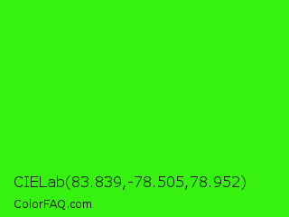 CIELab 83.839,-78.505,78.952 Color is a normal green color and the nearest color is Neon Green #39ff14. Hex code #37f10f and RGB value is rgb(55,241,15). In RGB color space, this color is composed of 22% red, 95% green, 6% blue, In CMYK color space, this color is composed of 77% cyan, 0% magenta, 94% yellow , 5% black , In HSL color space, this color has a hue angle of 109° , 89% saturation and 50% lightness.