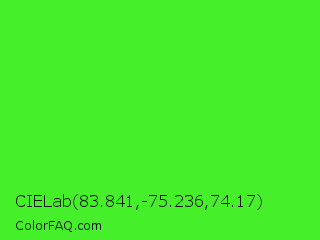 CIELab 83.841,-75.236,74.17 Color is a normal green color and the nearest color is Neon Green #39ff14. Hex code #45f02b and RGB value is rgb(69,240,43). In RGB color space, this color is composed of 27% red, 94% green, 17% blue, In CMYK color space, this color is composed of 71% cyan, 0% magenta, 82% yellow , 6% black , In HSL color space, this color has a hue angle of 112° , 87% saturation and 55% lightness.