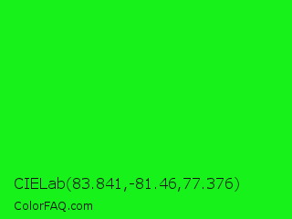 CIELab 83.841,-81.46,77.376 Color is a normal green color and the nearest color is Neon Green #39ff14. Hex code #17f21a and RGB value is rgb(23,242,26). In RGB color space, this color is composed of 9% red, 95% green, 10% blue, In CMYK color space, this color is composed of 90% cyan, 0% magenta, 89% yellow , 5% black , In HSL color space, this color has a hue angle of 121° , 89% saturation and 52% lightness.