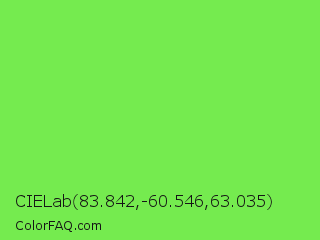 CIELab 83.842,-60.546,63.035 Color is a light green color and the nearest color is Kiwi #8ee53f. Hex code #75eb4f and RGB value is rgb(117,235,79). In RGB color space, this color is composed of 46% red, 92% green, 31% blue, In CMYK color space, this color is composed of 50% cyan, 0% magenta, 66% yellow , 8% black , In HSL color space, this color has a hue angle of 105° , 80% saturation and 62% lightness.