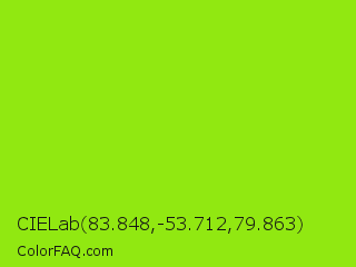 CIELab 83.848,-53.712,79.863 Color is a normal green color and the nearest color is Alien Armpit #84de02. Hex code #91e811 and RGB value is rgb(145,232,17). In RGB color space, this color is composed of 57% red, 91% green, 7% blue, In CMYK color space, this color is composed of 38% cyan, 0% magenta, 93% yellow , 9% black , In HSL color space, this color has a hue angle of 84° , 86% saturation and 49% lightness.