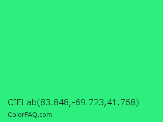 CIELab 83.848,-69.723,41.768 Color is a normal green color and the nearest color is UFO Green #3cd070. Hex code #2cef7e and RGB value is rgb(44,239,126). In RGB color space, this color is composed of 17% red, 94% green, 49% blue, In CMYK color space, this color is composed of 82% cyan, 0% magenta, 47% yellow , 6% black , In HSL color space, this color has a hue angle of 145° , 86% saturation and 55% lightness.