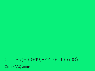 CIELab 83.849,-72.78,43.638 Color is a normal green color and the nearest color is Spring Green #00ff7f. Hex code #08f07a and RGB value is rgb(8,240,122). In RGB color space, this color is composed of 3% red, 94% green, 48% blue, In CMYK color space, this color is composed of 97% cyan, 0% magenta, 49% yellow , 6% black , In HSL color space, this color has a hue angle of 149° , 94% saturation and 49% lightness.