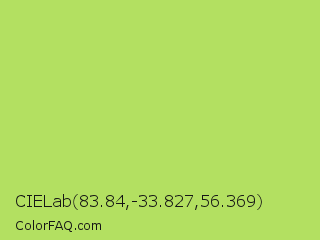 CIELab 83.84,-33.827,56.369 Color is a light green color and the nearest color is Inchworm #b2ec5d. Hex code #b3e061 and RGB value is rgb(179,224,97). In RGB color space, this color is composed of 70% red, 88% green, 38% blue, In CMYK color space, this color is composed of 20% cyan, 0% magenta, 57% yellow , 12% black , In HSL color space, this color has a hue angle of 81° , 67% saturation and 63% lightness.