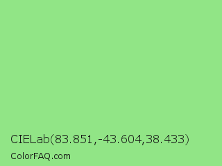 CIELab 83.851,-43.604,38.433 Color is a light green color and the nearest color is Light Green #90ee90. Hex code #91e586 and RGB value is rgb(145,229,134). In RGB color space, this color is composed of 57% red, 90% green, 53% blue, In CMYK color space, this color is composed of 37% cyan, 0% magenta, 41% yellow , 10% black , In HSL color space, this color has a hue angle of 113° , 65% saturation and 71% lightness.