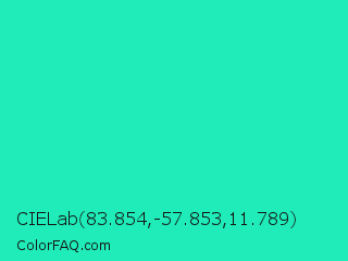 CIELab 83.854,-57.853,11.789 Color is a normal cyan color and the nearest color is Turquoise PWG #30d5c8. Hex code #1fecb9 and RGB value is rgb(31,236,185). In RGB color space, this color is composed of 12% red, 93% green, 73% blue, In CMYK color space, this color is composed of 87% cyan, 0% magenta, 22% yellow , 7% black , In HSL color space, this color has a hue angle of 165° , 84% saturation and 52% lightness.