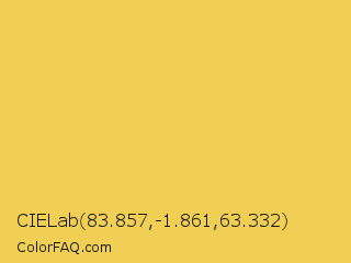 CIELab 83.857,-1.861,63.332 Color is a light yellow color and the nearest color is Cream Can #f5c85c. Hex code #f0cf54 and RGB value is rgb(240,207,84). In RGB color space, this color is composed of 94% red, 81% green, 33% blue, In CMYK color space, this color is composed of 0% cyan, 14% magenta, 65% yellow , 6% black , In HSL color space, this color has a hue angle of 47° , 84% saturation and 64% lightness.