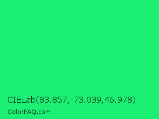 CIELab 83.857,-73.039,46.978 Color is a normal green color and the nearest color is Spring Green #00ff7f. Hex code #1bf073 and RGB value is rgb(27,240,115). In RGB color space, this color is composed of 11% red, 94% green, 45% blue, In CMYK color space, this color is composed of 89% cyan, 0% magenta, 52% yellow , 6% black , In HSL color space, this color has a hue angle of 145° , 88% saturation and 52% lightness.