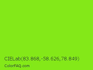 CIELab 83.868,-58.626,78.849 Color is a normal green color and the nearest color is Alien Armpit #84de02. Hex code #84ea17 and RGB value is rgb(132,234,23). In RGB color space, this color is composed of 52% red, 92% green, 9% blue, In CMYK color space, this color is composed of 44% cyan, 0% magenta, 90% yellow , 8% black , In HSL color space, this color has a hue angle of 89° , 83% saturation and 50% lightness.